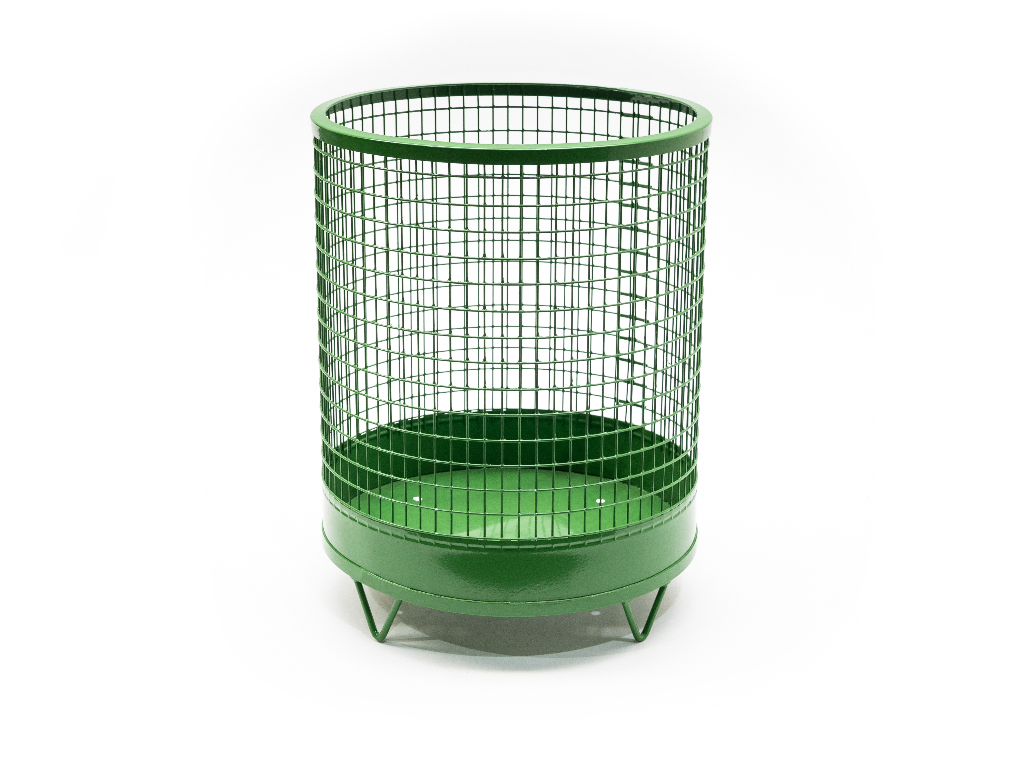 Drahtabfallkorb aus Punktschweißgitter, rund, feuerschlussverzinkt oder RAL 6010 grasgrün, mit zusätzl. Blechsockel, vier Füße aus Rundeisen, Winkelprofil 15 x 15 x 2 mm